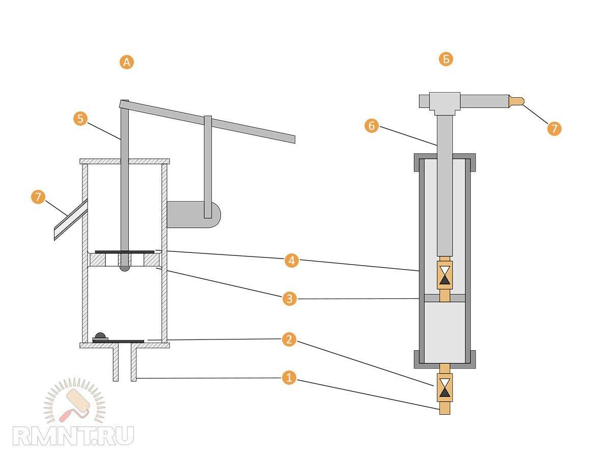 А — Классическая схема ручной помпы. Б — Вариант самодельной помпы из пластиковых труб. Схема устройства: 1 — вводной патрубок; 2 — обратный клапан; 3 — поршень; 4 — обратный клапан; 5 — шток; 6 — шток, объединенный с отводящим патрубком; 7 — слив помпы