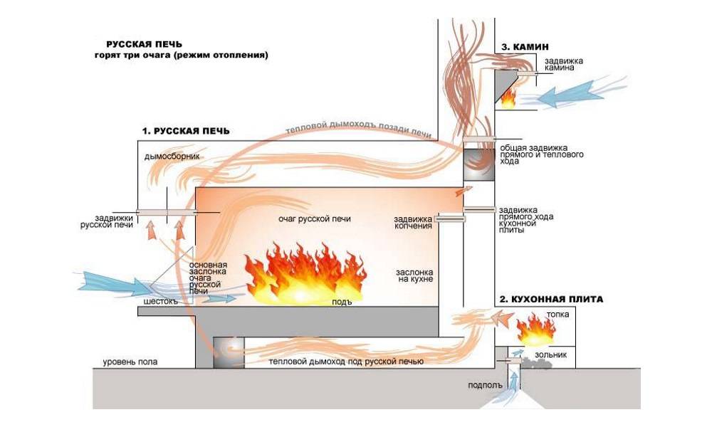 Русская печка в разрезе во время протапливания и томленияИсточник 2proraba.com
