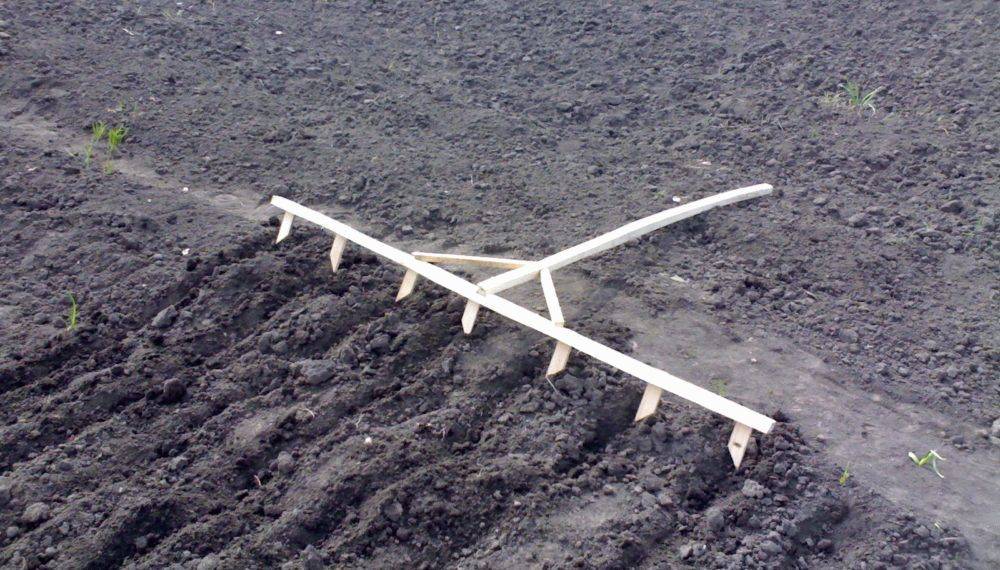 Работа с этим инвентарем происходит следующим образом: вспахать грядки, нарезать с помощью маркера борозды и проделать 2 готовых лунки, а одну наметить. После этого остается только положить в углубления семена и немного присыпать их землей. На фото маркер из дерева.