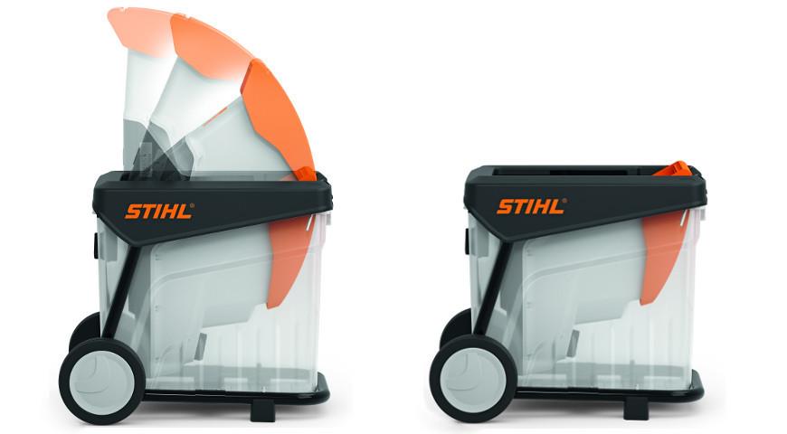 Верхний приемник позволяет загружать ветки большого диаметра. Нижний бункер при необходимости укладывается на землю, позволяя загружать ботву и мелкие растительные отходы непосредственно с грядки.