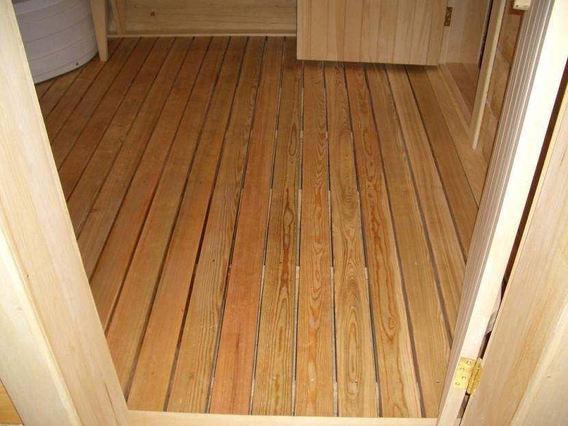 - Протекающий. Подходит для парных помещений с основанием на столбах или сваях. Пол из древесины устанавливается на лагах. Они закреплены на опорах фундамента или по периметру нижнего венца сруба бани. Сквозь расстояние между половицами вода стекает в нижний отсек. Отсюда попадает в систему водоотвода.