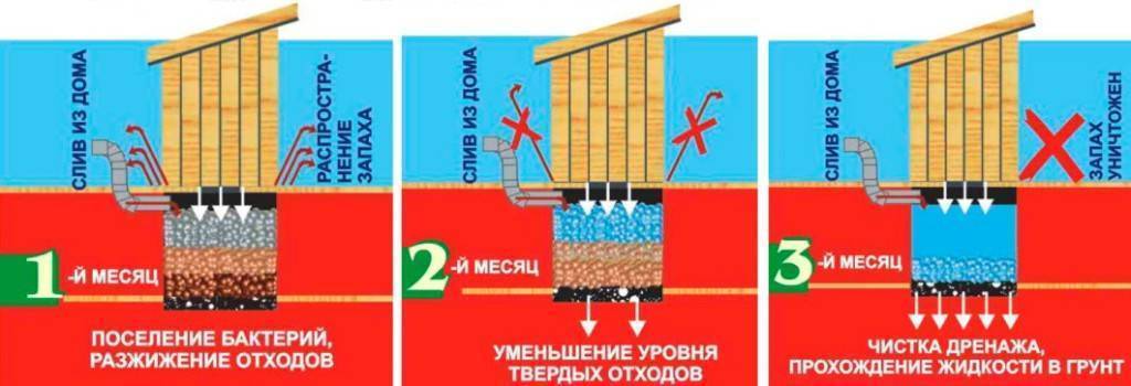 В процессе переработки органические отходы превращаются в твердые остатки, которые оседают на дно, и жидкость, которой можно поливать огород. Через некоторое время, когда твердых осадков накопится немалое количество, их откачивают с помощью специальной ассенизаторской машины.
