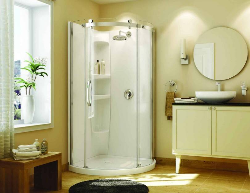 Стекло. В зависимости от формы кабины, стеклянные дверки бывают прямоугольной или сферической формы