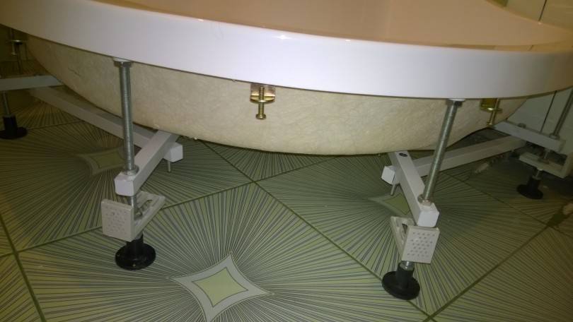 Каркас примеряем с учетом того, чтобы все его отверстия для крепежа, как на дне поддона, так и на углах поддона попадали на закладные.(это те части с обратной стороны поддона которые выпирают и предназначены как раз для того, чтобы там крепить каркас)