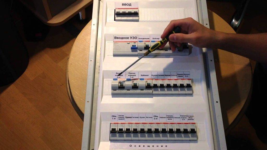 Для наглядности и удобства подключения отдельных потребителей их принято разделять по группам. Такой подход позволяет собрать горизонтальную линейку из дифавтоматов. Обычно она располагается в нижней части щита. Каждый автомат помечается отдельной биркой, указывающей на его назначение. Например, «свет в гостиной» или «стиральная машина».