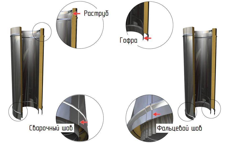 О двухконтурной трубе из нержавеющей стали говорят как о самой надёжной конструкции. Сэндвич-система способна хорошо функционировать, будучи смонтированной как внутри дома, так и за его пределами. Это заслуга промежуточного слоя изделия — негорючего материала, удерживающего тепло. Им может быть обычная минеральная вата.