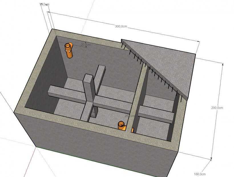Очистительное сооружение может располагаться до 20 метров от здания, грязная вода по отводам поступает в общую емкость. Элементы, которые не могут раствориться остаются на дне, а с помощью анаэробных бактерий водная часть начинает бродить. Во время жизнедеятельности бактерий происходит выделение метана, для его отвода используют трубу, установленную на 1-2 метра выше крыши здания.