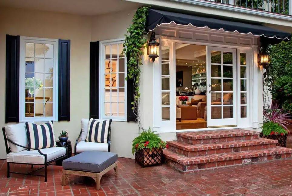 Тканевый навес на крыльцом защитит вход в дом от попадания солнца и дождя