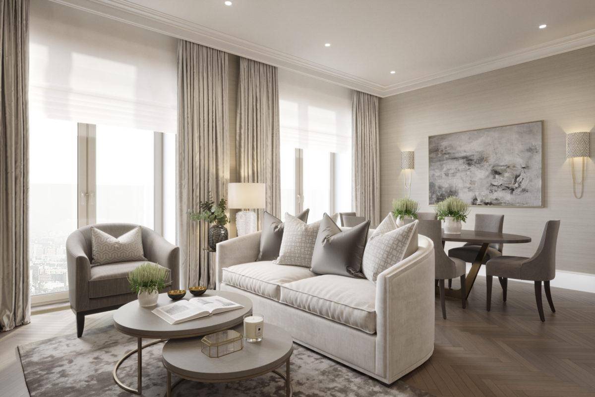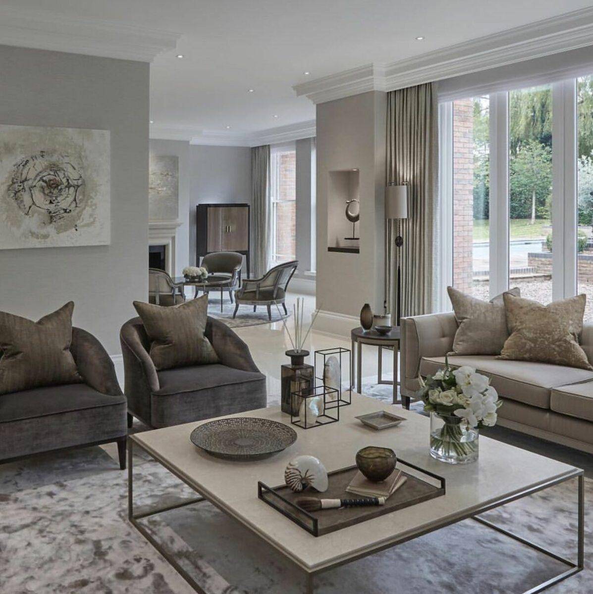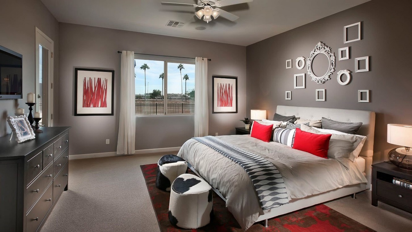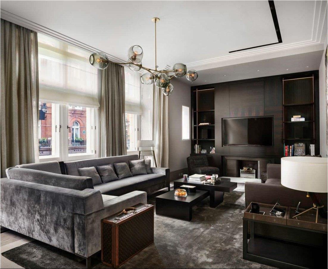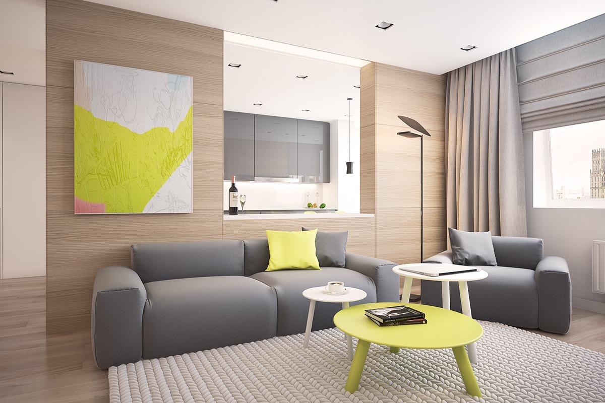 Темные оттенки серого в сочетании с бежевым, можно разбавить нейтральными цветам, белым, черным или коричневым. Прибавить комнате света можно с помощью светлых занавесок и больших окон. Также в серо-бежевую комнату можно добавить ярких акцентов, например персиковые подушки, ковер с желтым узором, большие цветы в горшках.