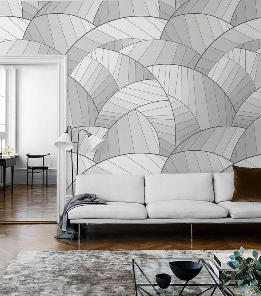 Для просторной спальни можно выбрать покрытия с крупными орнаментами и рисунками: например, серые обои с цветами, линиями, геометрическими фигурами, классическими принтами или абстрактными изображениями. В современных интерьерах будут смотреться эффектно реалистичные фотообои серого цвета.