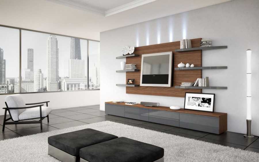 Рекомендуется выбирать настенную мебель серого цвета, гармонирующую с тоном отделки, или светлую или белую (темно-коричневый уместен как для формальных, так и для больших помещений). Выбирая цвет мебели, лучше отдать предпочтение светлым породам дерева.