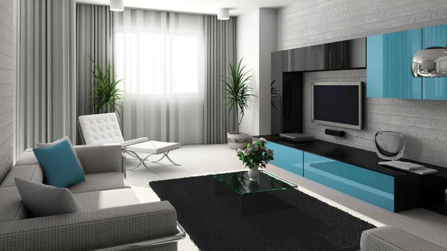 Также интересно выглядит сочетание оттенка мокрого асфальта с насыщенным бирюзовым. Интерьер в такой гамме получится воздушным, успокаивающим и располагающим к комфортному времяпровождению. Гамма хорошо подходит для . При этом возможно как сочетание серых стен и мягкой мебели с голубой обивкой, так и обратный вариант.