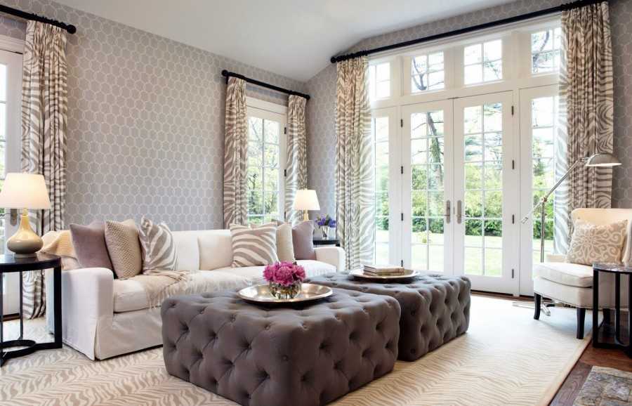 На фото интерьер гостиной с флизелиновыми обоями с декором, которые подходят под шторы и текстиль.