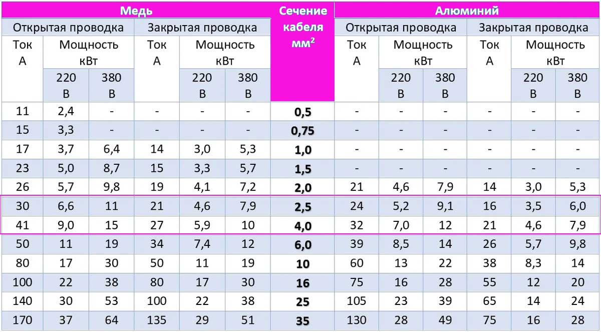 - Закрытая проводка — ток 21А, мощность 4.6 кВт для медной жилы и ток 16А, мощность 3.5 кВт алюминиевой жилы.