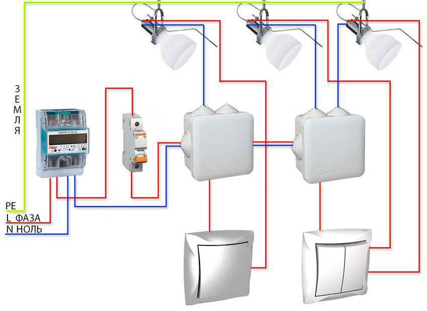 Переключатели подсоединяются в разрыве фазного провода, а нуль, пройдя распределительную коробку, направлен на осветительный прибор. Пропуск фазы через выключатель обеспечит безопасность во время ремонта и обслуживания светильника.