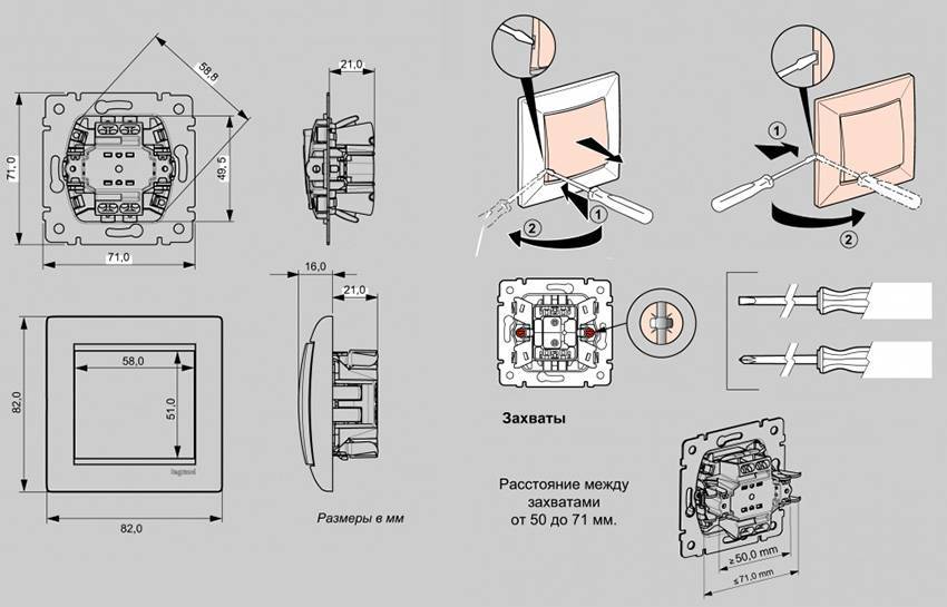 Изделия Legrand выделяются дизайном, качеством сборки, удобством эксплуатации. Трудности иногда возникают при монтаже на установочное место: его стандартные размеры не всегда совпадают с параметрами изделий «Легранд».