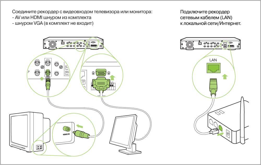 Шаг 4. Подключите видеорекордер к монитору. Для организации удаленного доступа необходим выход в Интернет либо в локальную сеть. Потребуется обычный LAN-кабель (в комплекте), с помощью которого рекордер можно подключить, например, к роутеру.