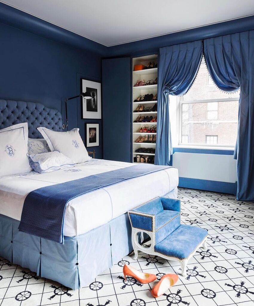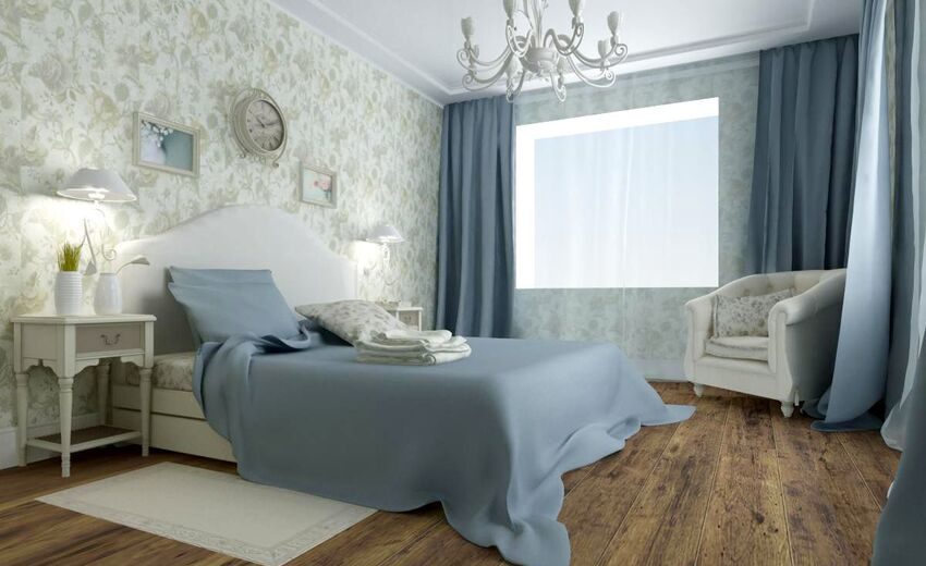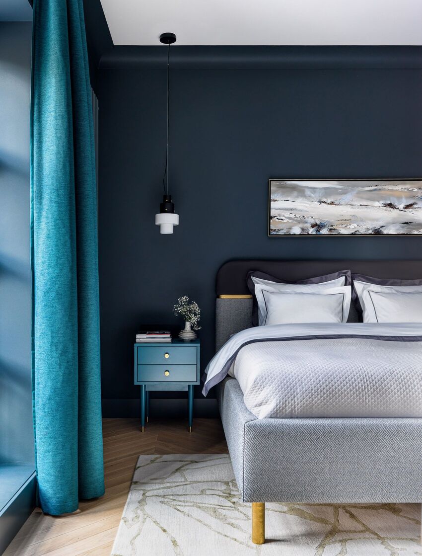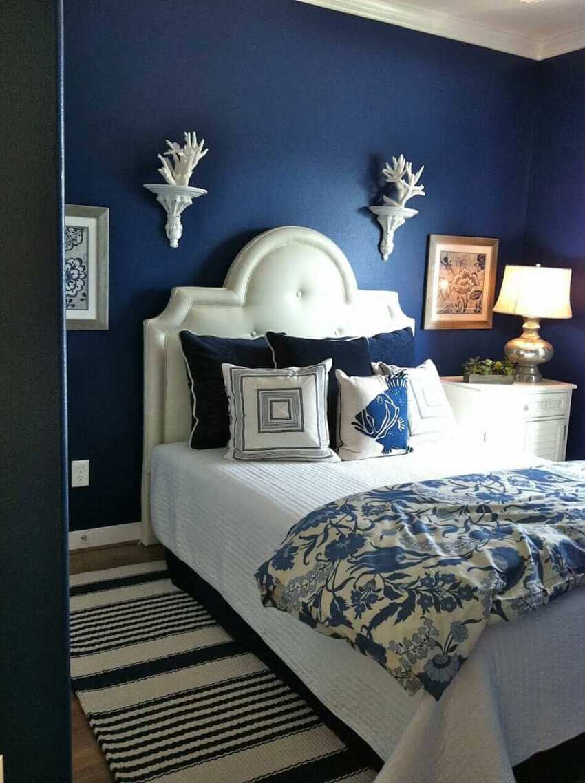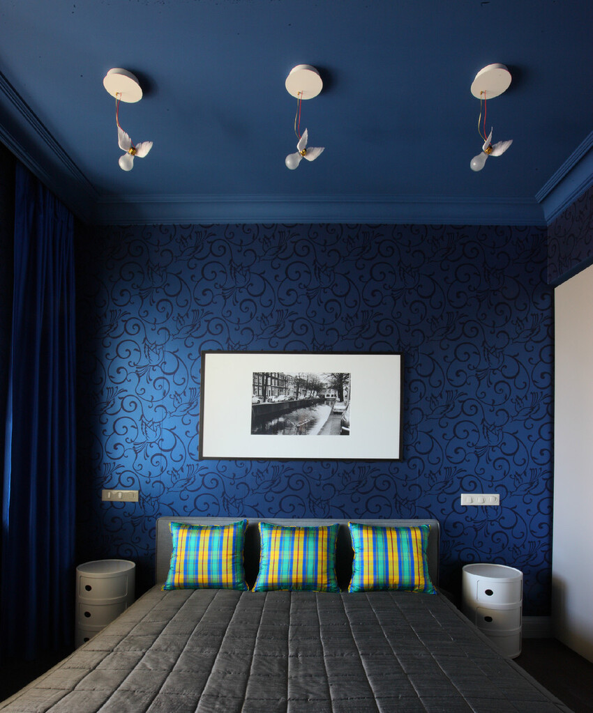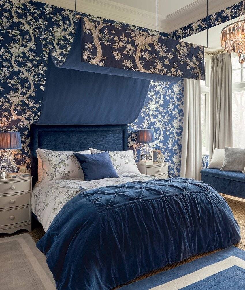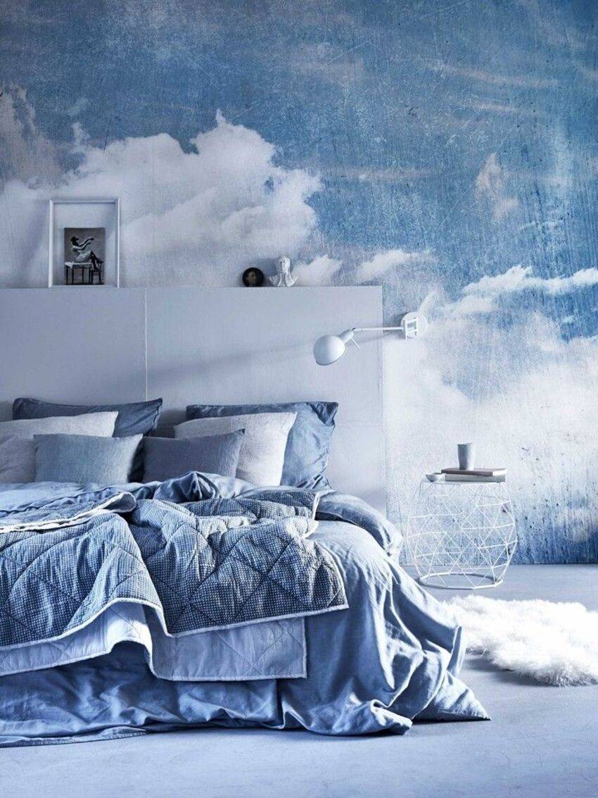 Если в спальне много окон, то синим можно оклеить все стены. Если же комната небольшая, и она недостаточно освещена, то синим можно отделать одну стену.