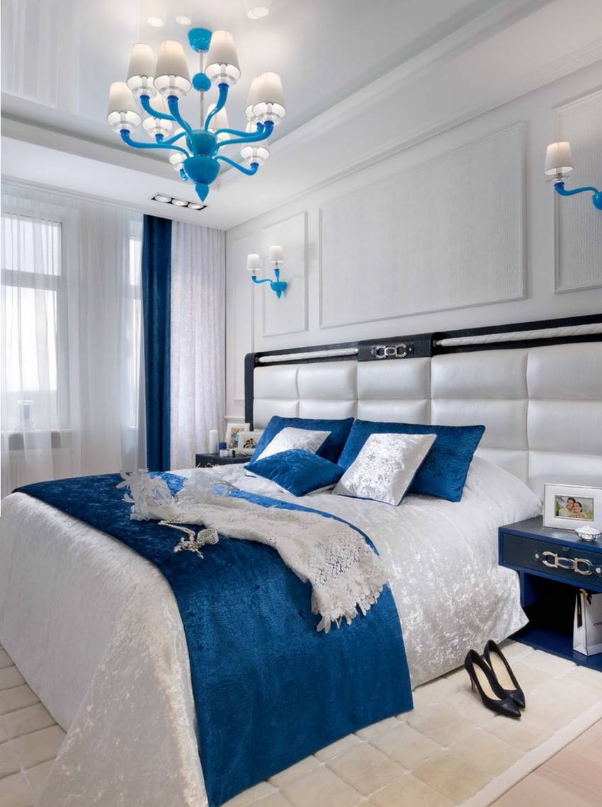 Правильное освещение и декор синей спальни