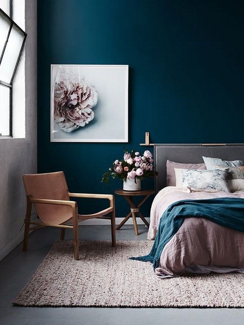 Акцентная стена. Так можно обозначить определенную часть комнаты и привлечь к ней больше внимания. Оформить ее выразительным тоном синего, нанесенным узором или текстурой, природным принтом, объемным изображением.