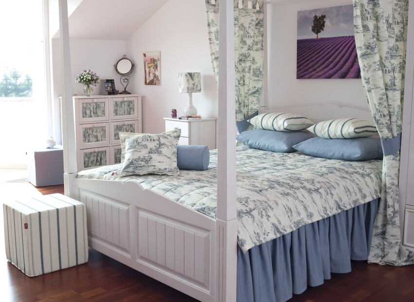 Прованс предусматривает цветочные атрибуты, узоры, оборки.