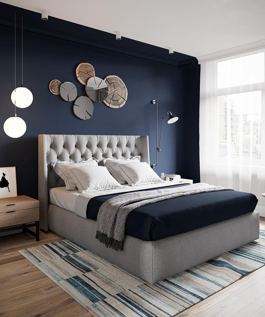 В такой темно-синей спальне присутствует модный, утонченный и дизайнерский интерьер. Основными отличиями такого декора выступают современные аксессуары, выделяющие черты стиля и роскоши комнаты.