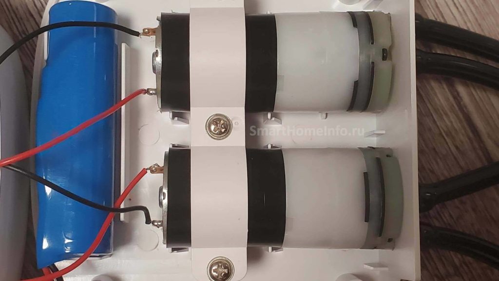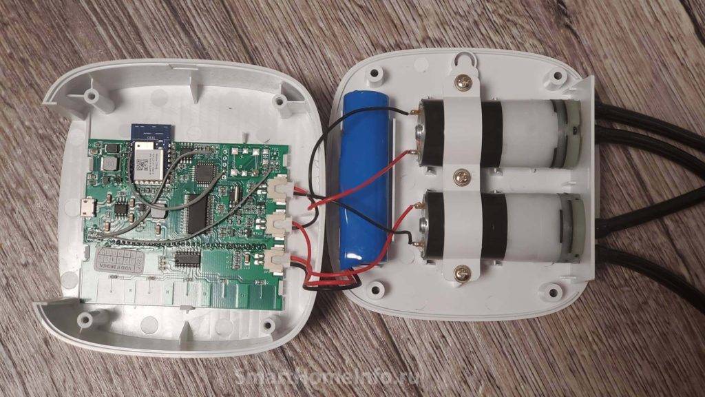 Внутри видим основную плату, два насоса и аккумулятор емкостью 2600 мАч для автономной работы. По заявлению производителя его достаточно для автономной работы в течение 4-5 дней в режиме ожидания. У меня получилось 3-4 дня. Так что нужно или несколько раз в неделю ставить на зарядку или на постоянку подключать к розетке. Самый лучший вариант – покупка солнечных батарей. Время автономной работы можно немного увеличить или уменьшить, задав в настройках часы работы Wi-Fi.