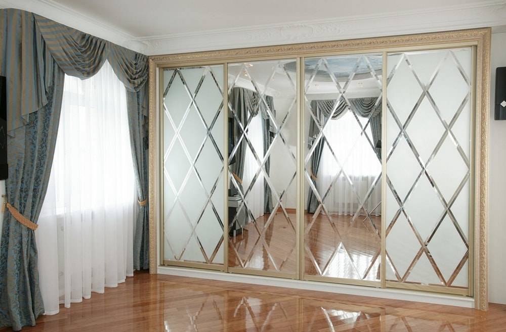 Рисунок наносится на зеркальную поверхность с помощью воздушной струи и мелкого песка. Узор получается матовым и сдержанным и становится стильным и ненавязчивым украшением шкафа. Такой вариант оформления створок подойдёт тем, кто любит простоту в интерьере. Учитывайте, что стеклянные двери с пескоструйным рисунком достаточно дороги.