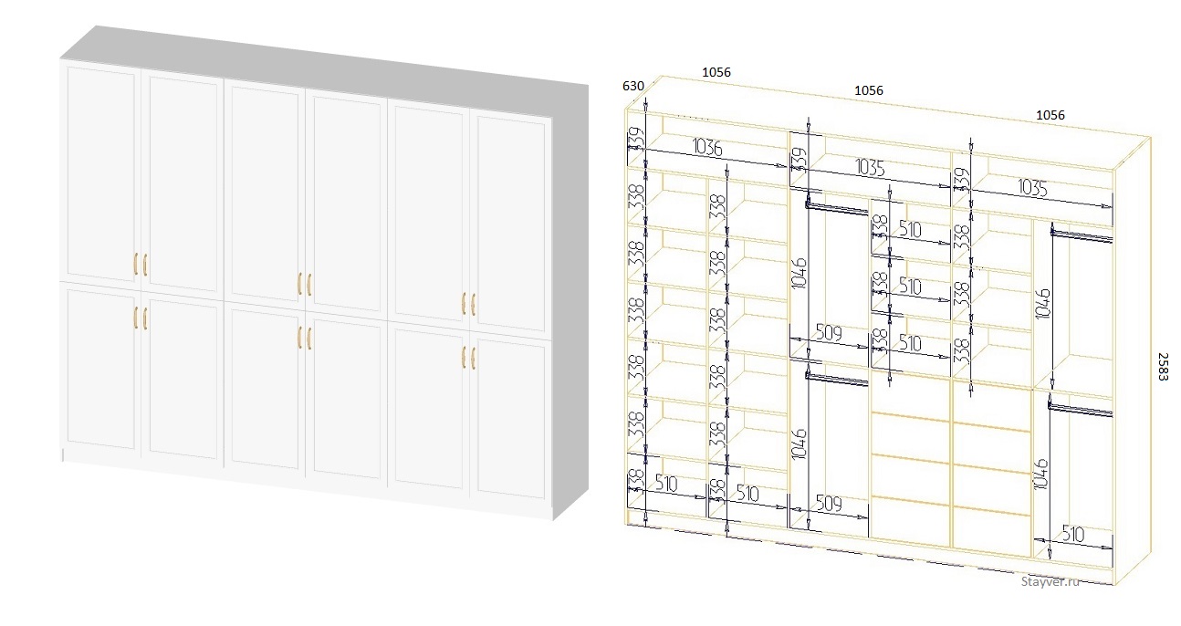 Просторные шкафы занимают много места, но при этом обладают самой современной системой хранения. Во внутреннем отсеке параллельно стене располагается стойка с плечиками, на верхней открытой полке поместятся объемные предметы быта.