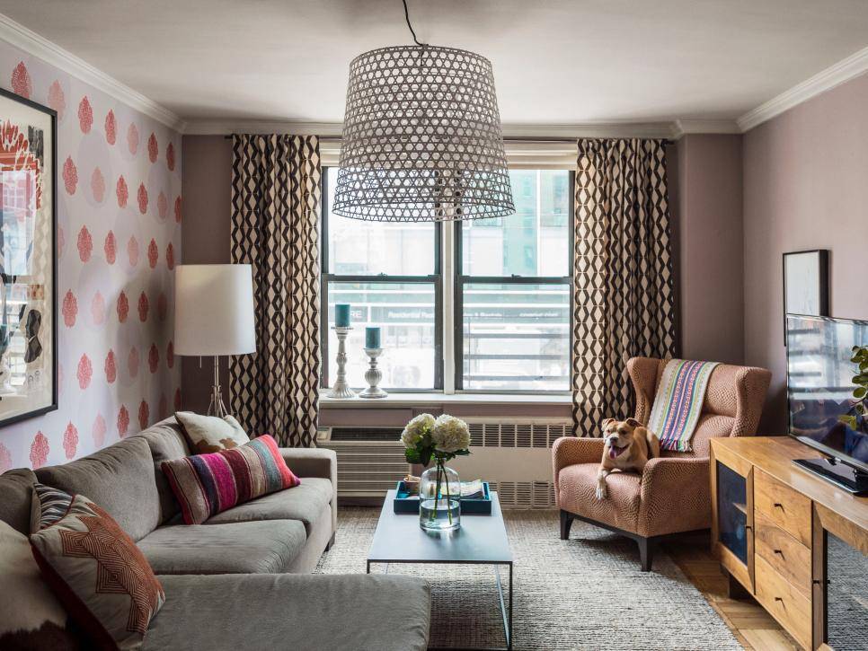 Стены гостиной, оклеенные персиковыми обоямиИсточник goodfon.ru