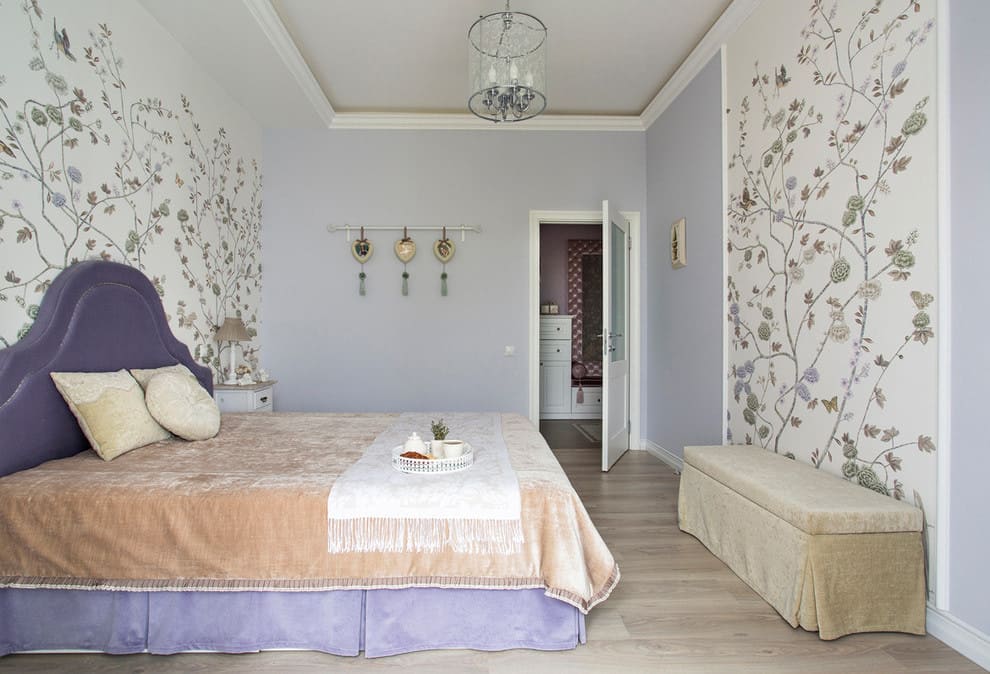 В зависимости от этой характеристики, владелец спальни определяет тип узора, его цвет и фактуру. Для потолков высотой менее 2,5 м выбирают полотна светлых тонов, на которых нет крупных узоров и грубой текстуры.