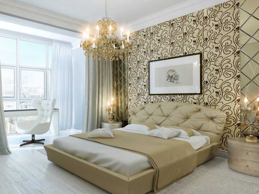 Узор + геометрия. Эта комбинации хорошо выглядят в классическом дизайне, где геометрия становится дополнением к рисунку. Геометрия подбирается спокойная, неяркая — тогда она не станет надоедать и будет выглядеть в интерьере спальни ненавязчиво.