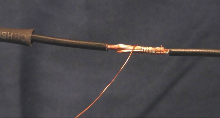 Распушить немного зачищенные участки соединяемой пары и полученные «метелки» вставить друг в друга. Для того, чтобы проводники приняли аккуратную форму, перед пайкой нужно их стянуть тонкой проволочкой. Затем смазать паяльным лаком и пропаять припоем.