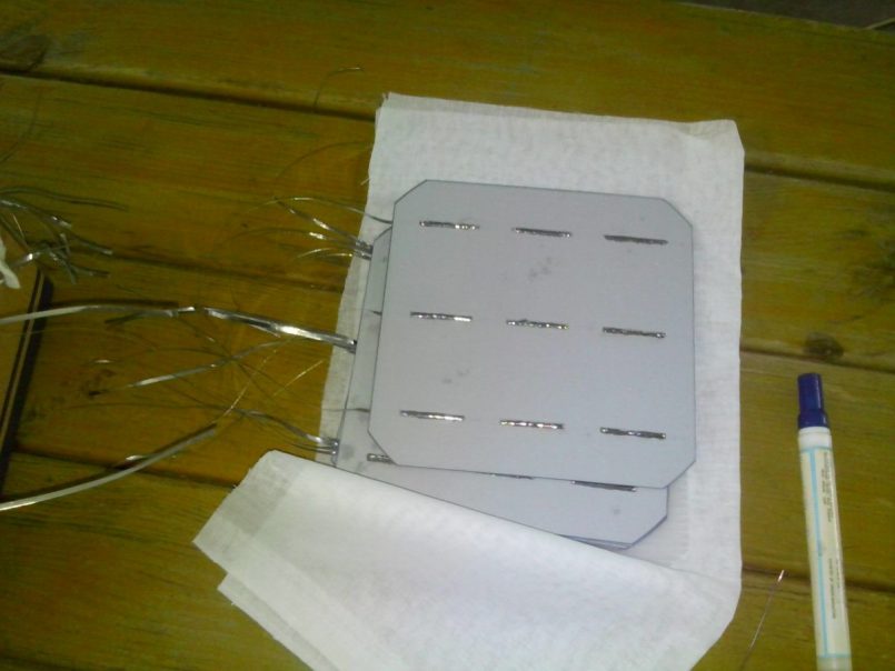 А теперь о том, как сделать солнечную батарею. Первым, что придется приобрести, будет набор преобразующих пластин, количество которых зависит от мощности самодельной гелиоэлектростанции. Для одной батареи нужно будет 36 штук. Можно воспользоваться набором Solar Cells, а также приобрести поврежденные элементы или с дефектами – это скажется лишь на внешнем виде батареи. Если они рабочие, то на выходе получится почти 19 Вольт. Спаивать их нужно с учетом на расширение – оставляя зазор до пяти миллиметров между ними. Устройство солнечной батареи своими руками требует предельной внимательности при исполнении пайки фотопластинок. Если пластинки приобретались без проводников, то их необходимо напаивать вручную. Процесс сложный и ответственный. Если работа выполняется паяльником на 60 Вт, лучше всего последовательно с ним подключить простую стоваттную лампочку.