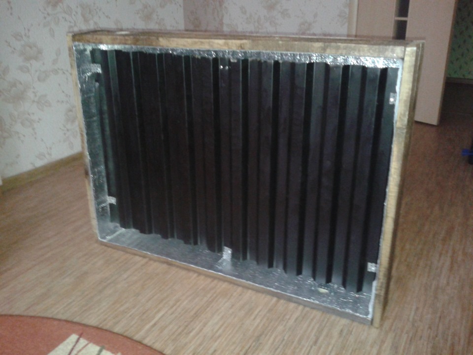 К внутренней стороне используемых стекол следует прикрепить 5 вертикальных, расположенных параллельно деревянных досок. Расстояние между ними должно быть примерно одинаковое. Длина брусков — чуть меньше, чем у короба, чтобы оставалось место для движения воздуха. Действует принцип шахмат: