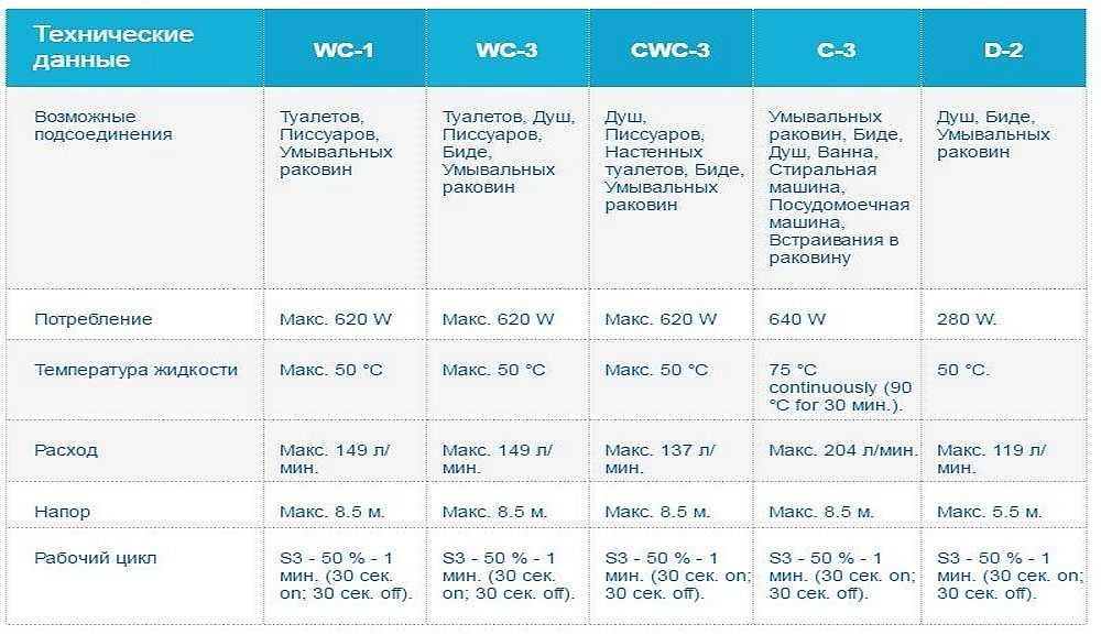 Такой агрегат может перекачивать сточные воды, температура которых составляет от +35 до + 50 градусов. Многие модели имеют дополнительные отверстия для подключения душа или биде.