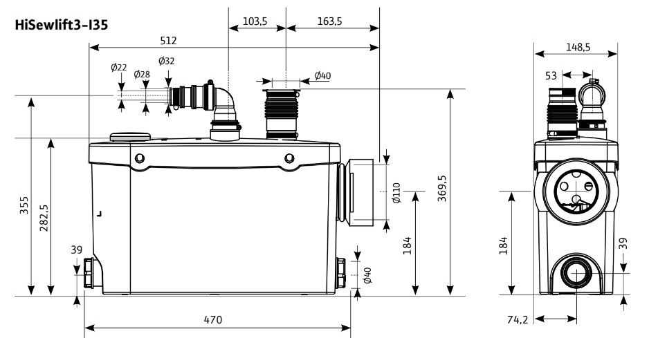 Диаметр входного и выходящего патрубка у сололифта не большие, всего 20-32 мм. Это не должно доставлять беспокойства, поскольку измельчитель в фекальном насосе вполне справляется со своим задачами даже при такой нагрузке