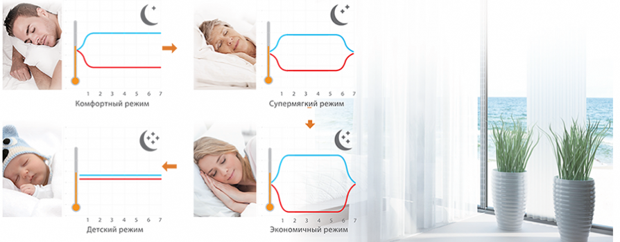 - плавно снижает температуру воздуха в помещении на пару градусов, что способствует здоровому сну, а ко времени пробуждения повышает ее до прежних значений