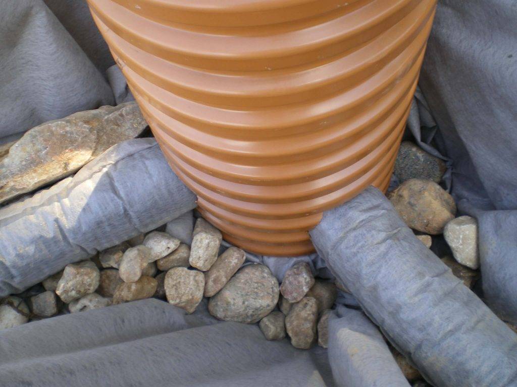 После сборки трубы траншею засыпают щебнем из расчета создания боковых и верхнего слоев толщиной не менее 150 мм. Засыпка закрывается геотекстилем, края ткани тщательно скрепляются между собой. Плотность ткани выбирают около 250 г/кв.метр. На собранный фильтр насыпается слой песка, затем траншеи заполняются грунтом.