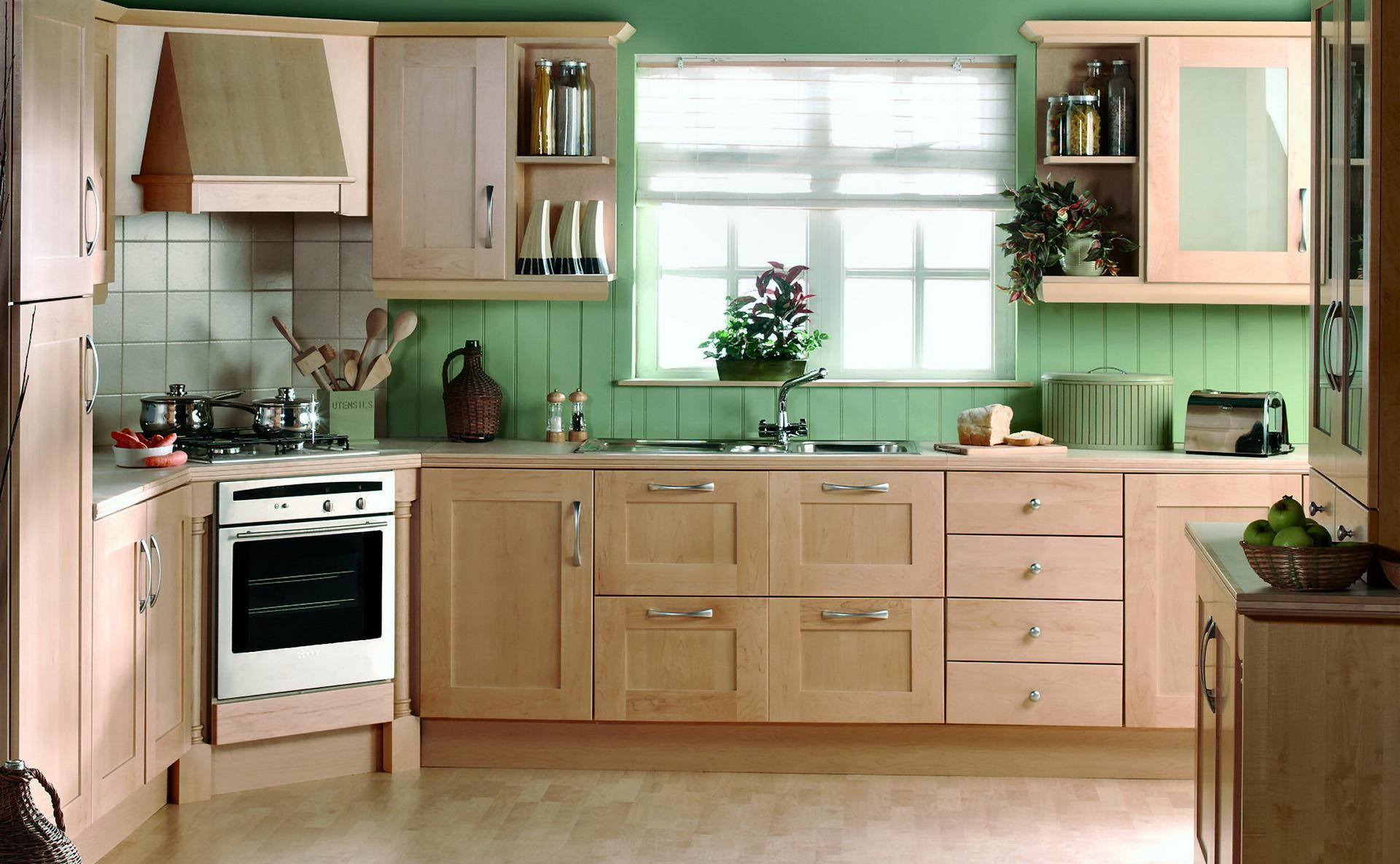 - Оттенки зелени создают летнее настроение и легкость жизни. Эффективно смотрятся при сочетании с цветами от черного до бежевого, используя предметы интерьера (гарнитур, кухонная утварь, мебель).