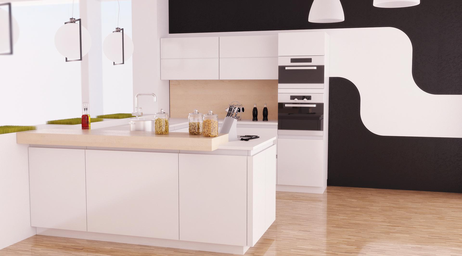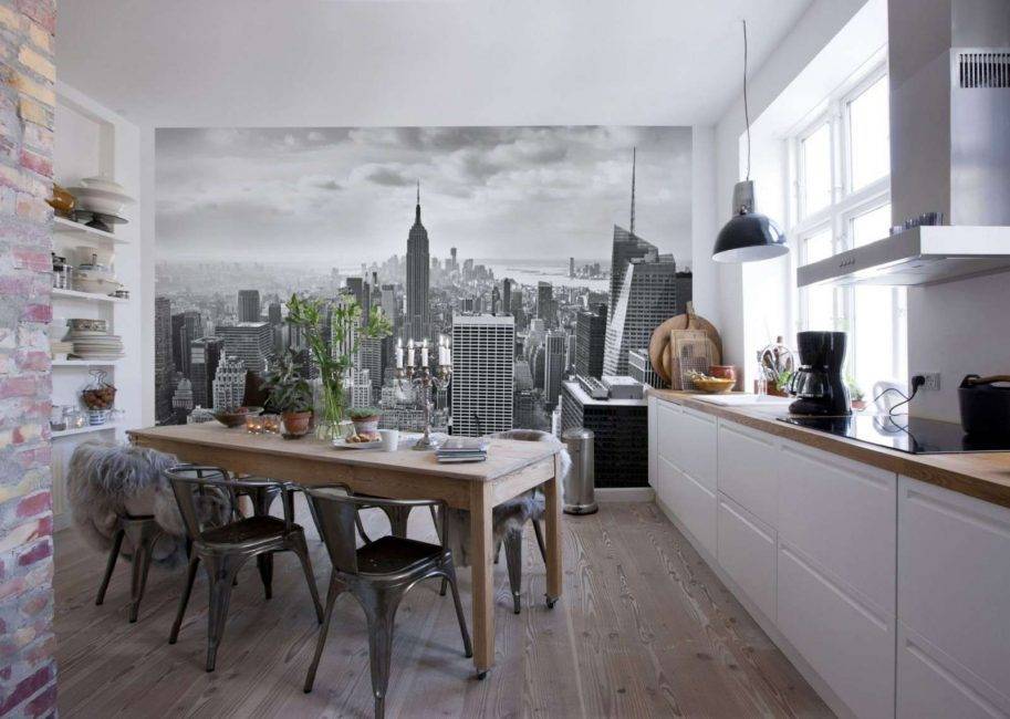 Для современной кухни в белых тонах подойдут обои с граффити, коллажем или фотообои, 3Д обои в качестве акцента на одной стене.