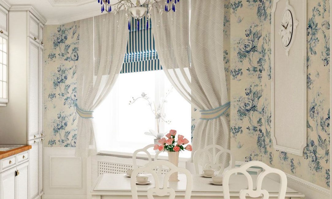 Занавеси должны минимально впитывать запахи, не мешать доступу света, проходу на балкон, быть пожаробезопасными. Хорошо смотрятся укороченные белые и бежевые шторы, шторы-кафе, римские шторы. Ламбрекен может быть жестким или не слишком пышным.