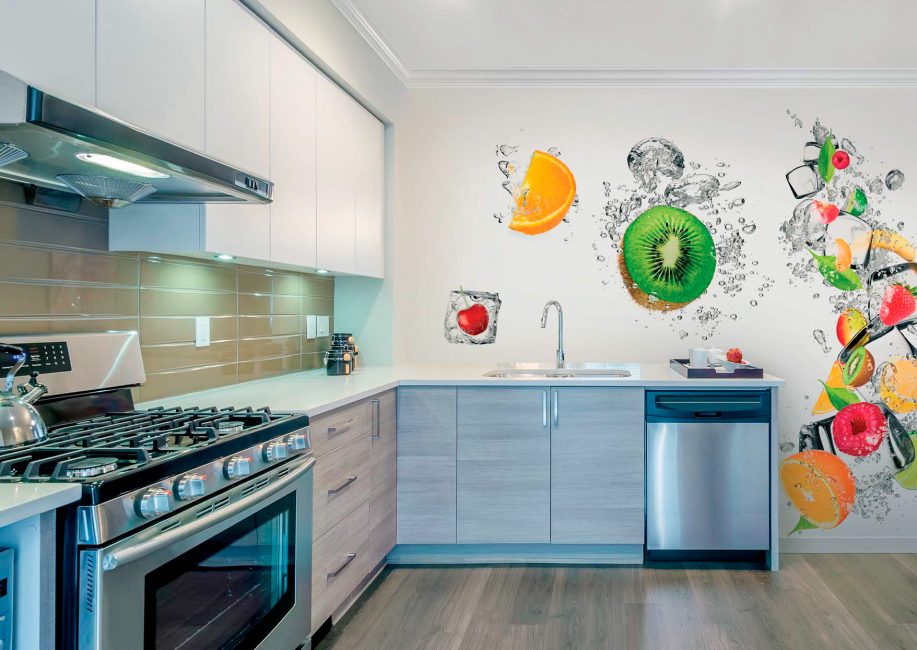 Совет: фотообои можно сделать на заказ с использованием собственных эскизов. Так вы сможете подогнать формат рисунка под особенности вашей кухни.