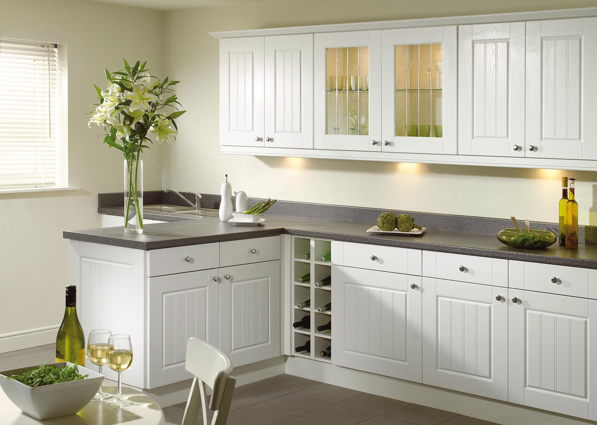 Дизайн кухни с белым гарнитуром можно часто менять за счет декоративных элементов (кухонных прихваток, полотенец, скатерти, цветов и фруктовых ваз). Также уместна будет меловая доска, картины, часы, фотообои, тарелки, надписи, наклейки, зеркальная мозаика.