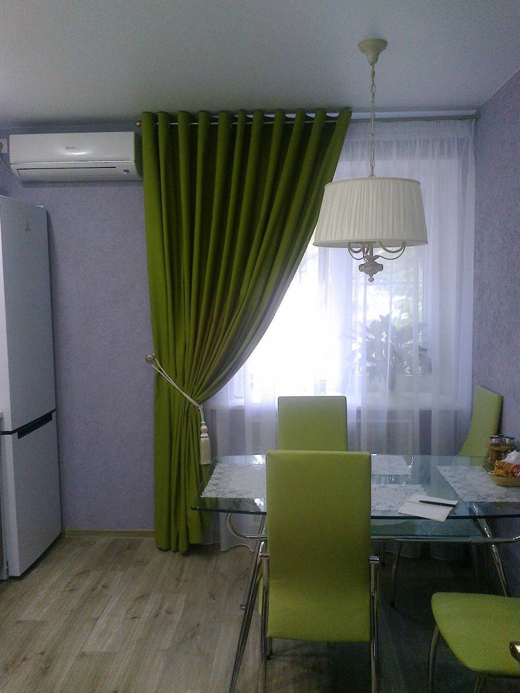 Портьеры с тюлем прекрасно будут смотреться на кухне с огромными окнами, а также высокими потолками, в случае если у вас кухня-студия, совмещена с лоджией или с балконом. Такой вариант оформления окон требует для себя двухрядный, двухпрофильный карниз. Крепить на него можно при помощи завязок, петель, крючков, прищепок с кольцами, люверсов.