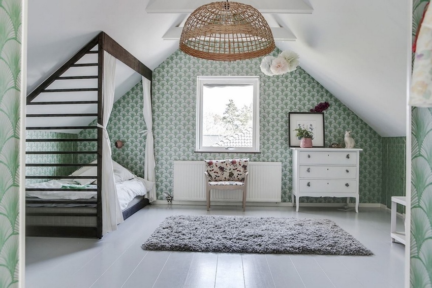 Чердак прекрасно подойдет для создания уютного уголка принцессы. Оптимальным выбором для девочек, старше 7 лет становится , в котором найдется место для кровати, хранения одежды, книг и любимых мелочей. В качестве ярких акцентов могут быть использованы шторы с тематическим рисунком, деревянный пол, или покрывало с оригинальным орнаментом.