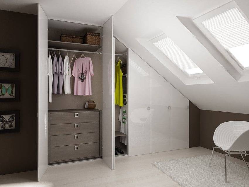 Интересное решение с вещевыми шкафами под скатной крышей помогает сэкономить место