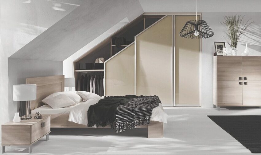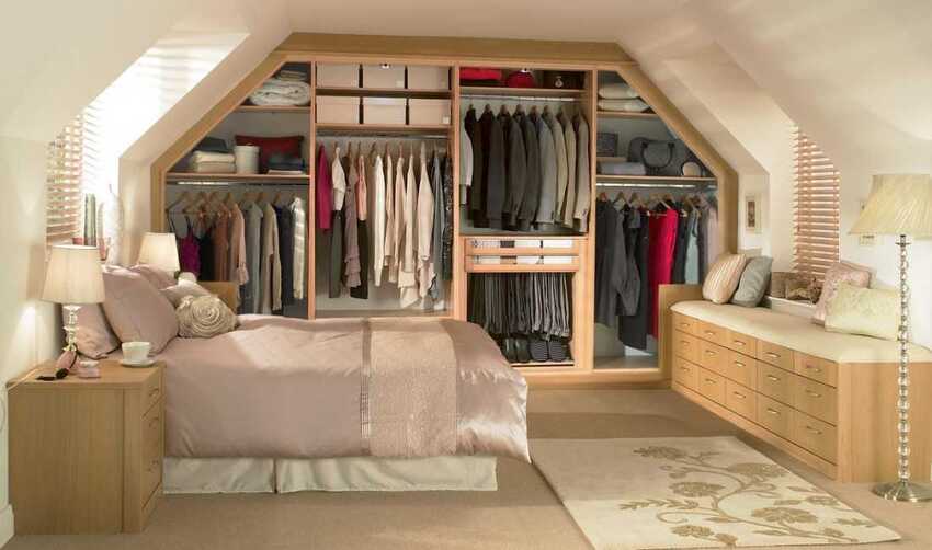 Если мансарда имеет довольно обширную площадь, владельцы могут организовать в спальне гардеробную. В комнате, имеющей уклон, гардеробную размещают около самой высокой или, напротив, у самой низкой стенки. Оптимальным считается размещение конструкции в углу комнаты.