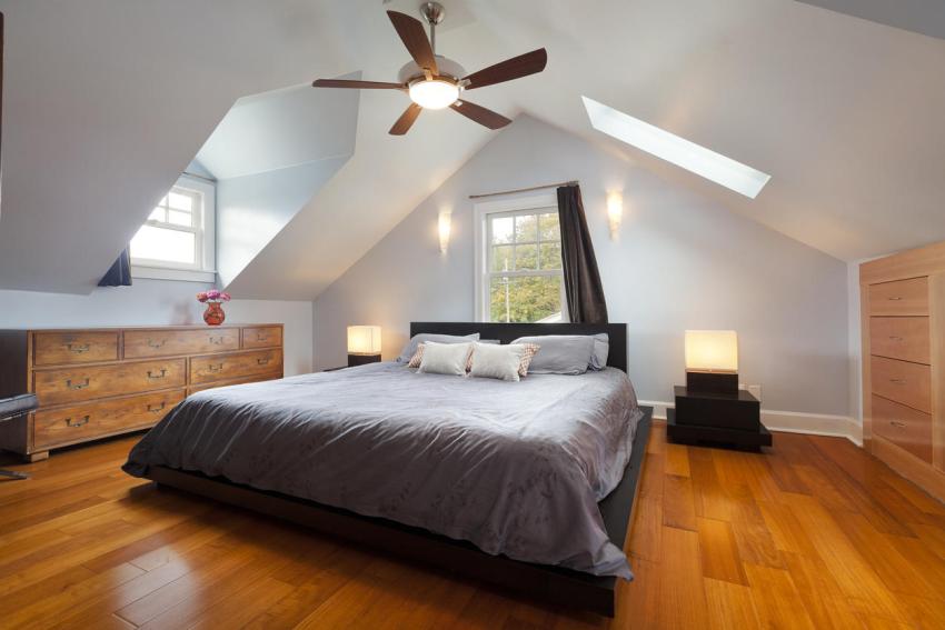 Правильное размещение мебели здесь подразумевает установку большой кровати в местах наибольшего скоса потолка, которое дает возможность максимально комфортно установить другую мебель, и визуально расширить пространство.