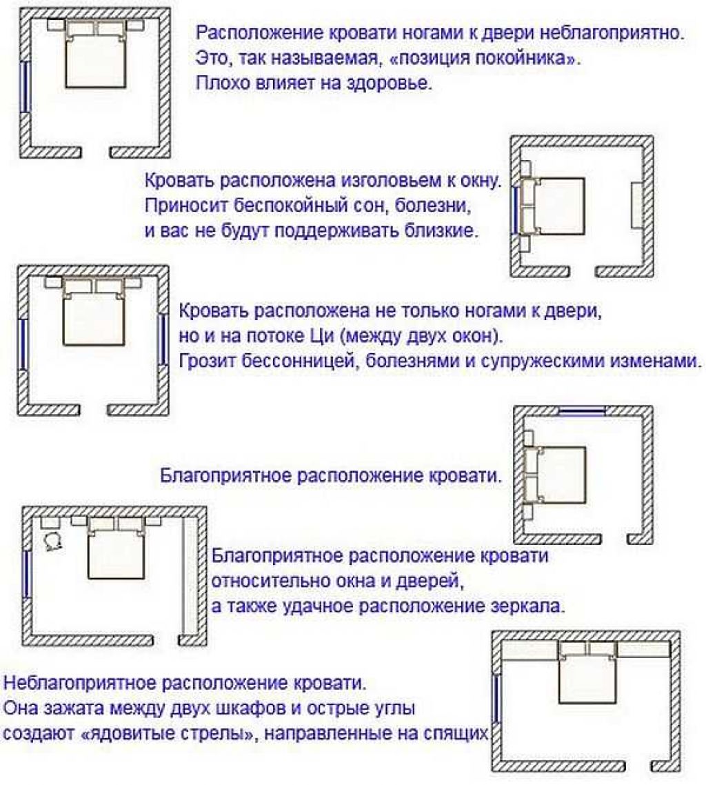 К наиболее распространенным запретам расположения кровати в комнате можно отнести её нахождение напротив двери, где ноги «смотрят» на дверной проём. А также напротив зеркала, которое во время сна будет вызывать потерю энергии и сил.
